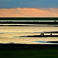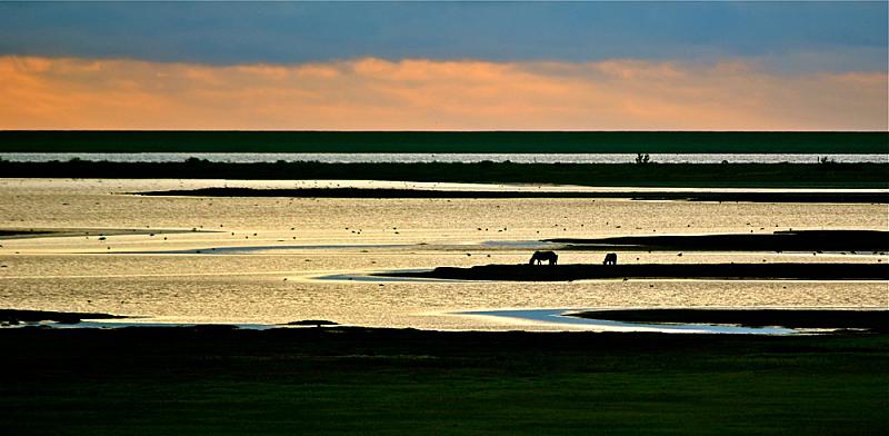 Vanaf een uitkijktoren zicht op het Lauwersmeer met 2 grazende konikspaarden.
