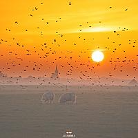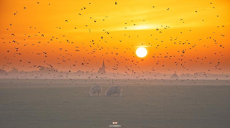 Zonsondergang op zn Tessels! Zwerm vogels, schapen, schapenboet, beetje mist, kerktoren en een rond oranje zonnetje.... mooier gaat het niet worden :) Op groter scherm nog mooier. #Texel #justinsinner #waddeneiland #canonnederland #fotografie
