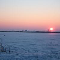 Zonsopgang bij rietkraag over een bevroren Drontermeer
