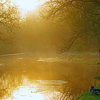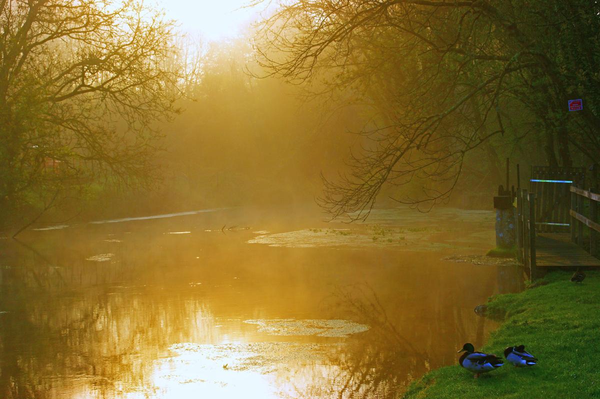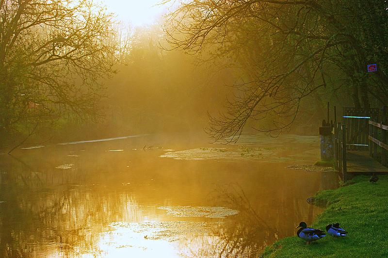 Zonopkomst boven een meertje in Laignes in Frankrijk