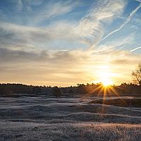 De zon komt op op de heide van landgoed Heidestein tijdens de eerste echte vorst van deze winter