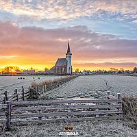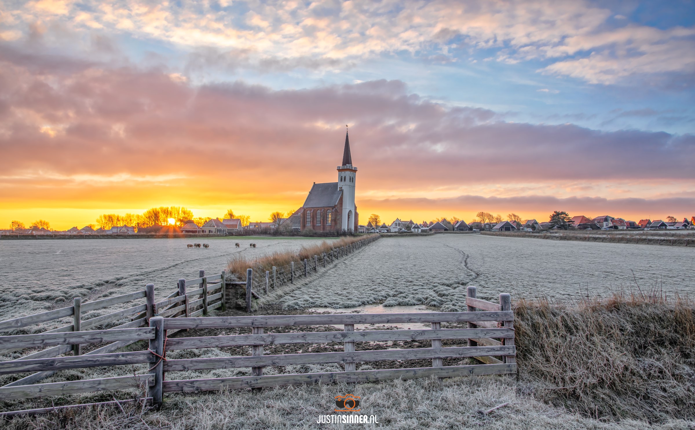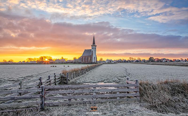 Zonsopkomst op Texel. Kerk van den Hoorn, het zuidelijkste dorp van Texel.