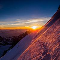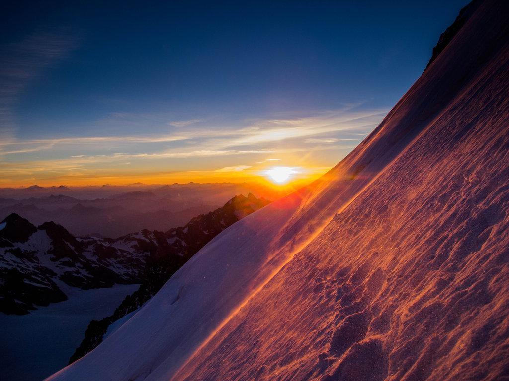 De zonsopkomst op 4000 meter na de beklimming van het Barre Noire Couloir.