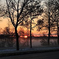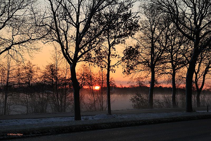 Vroeg in de morgen als de zon opkomt, de mist nog over het landschap ligt, is het heel koud