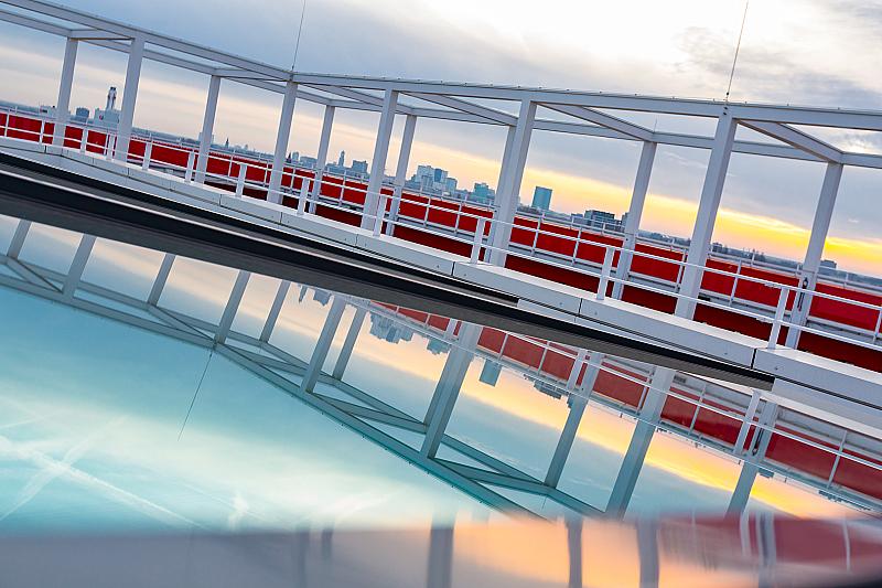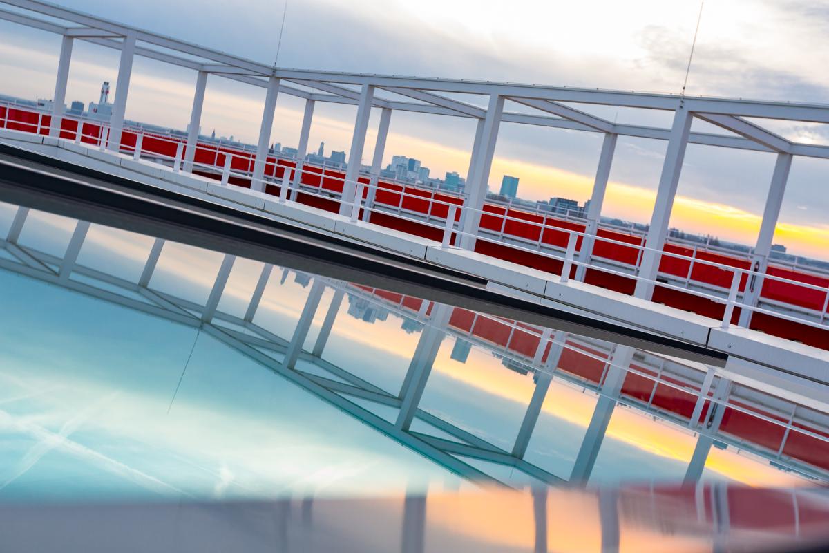 Op het dakterras van een bioscoop, met op de achtergrond de skyline van Utrecht centrum.
