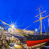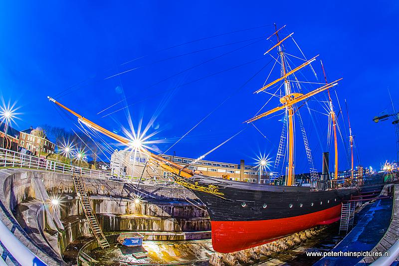 Lichtkunst route in Den Helder gelopen. Dit schip ligt uitgelicht in het droogdok. Hoe maak je daar nu een originele foto van? Sigma 10mm Fisheye op mijn Canon M5 gezet en het diafragma flink dichtgedraaid waardoor je het ster effect krijgt. In RAW gefotografeerd en in Lightroom HDR toegepast.