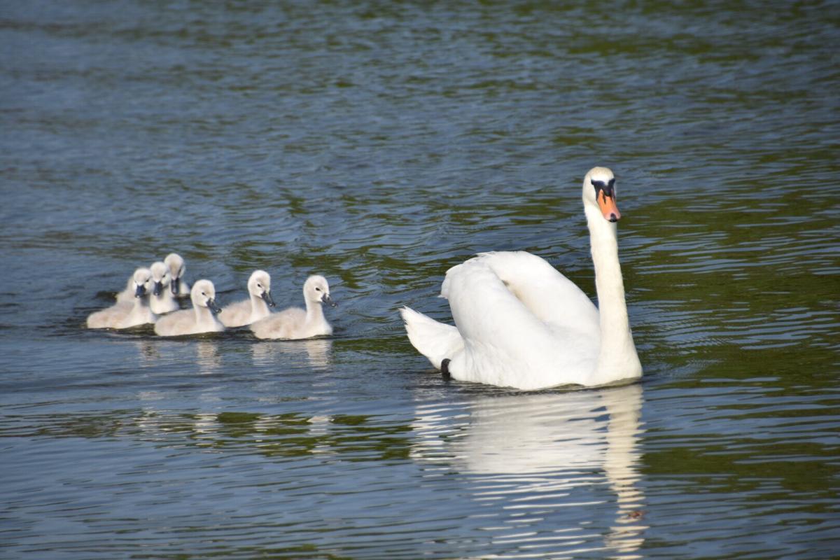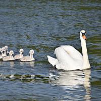 Zwanen zijn altijd mooi om te zien, en zeker met jongen erbij. Deze zwaan zwom samen met pa (helaas staat hij niet op de foto) en hun jongen vlakbij ons in een meertje, en op het moment dat ik de foto maakte zwommen de 6 jongen in een mooie formatie, maar ook de gezichtjes staan bijzonder 3 naar rechts gedraaid en 3 naar links gedraaid!