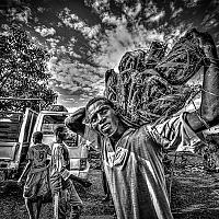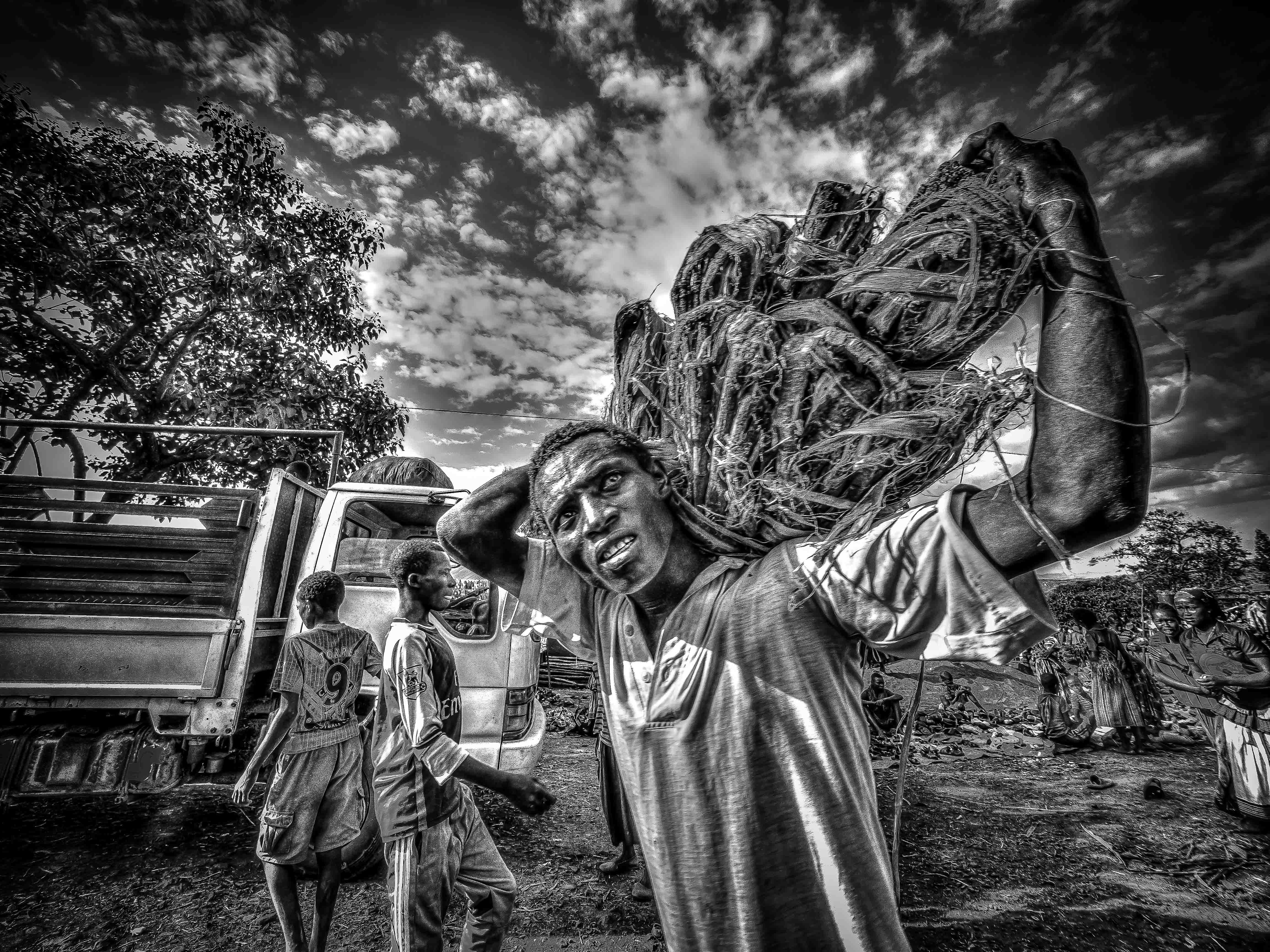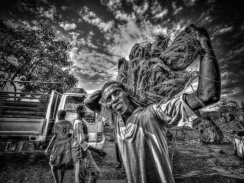 Ethiopië, Konso markt. Véél te zien en te fotograferen. Een totaal andere wereld. Ik liep waarschijnlijk in de weg. Kon nog net deze foto maken. Gekozen voor zwart-wit omdat dit meer het zware leven van deze mensen onderstreept dan de vrolijke kleuren die je elders op deze markt kunt zien.